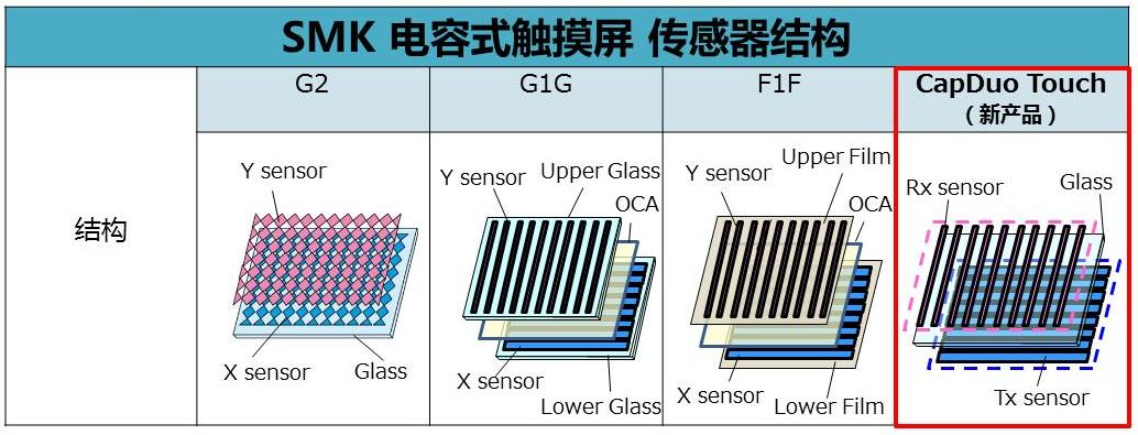 作为电容式触摸屏用传感器,SMK已经能够量产了用1块玻璃实现单侧2极的”G2”传感器、2块玻璃的“G1G”传感器、2张薄膜的“F1F”传感器,此次最新开发“CapDuo Touch”后,进一步扩充了产品阵容。